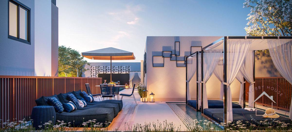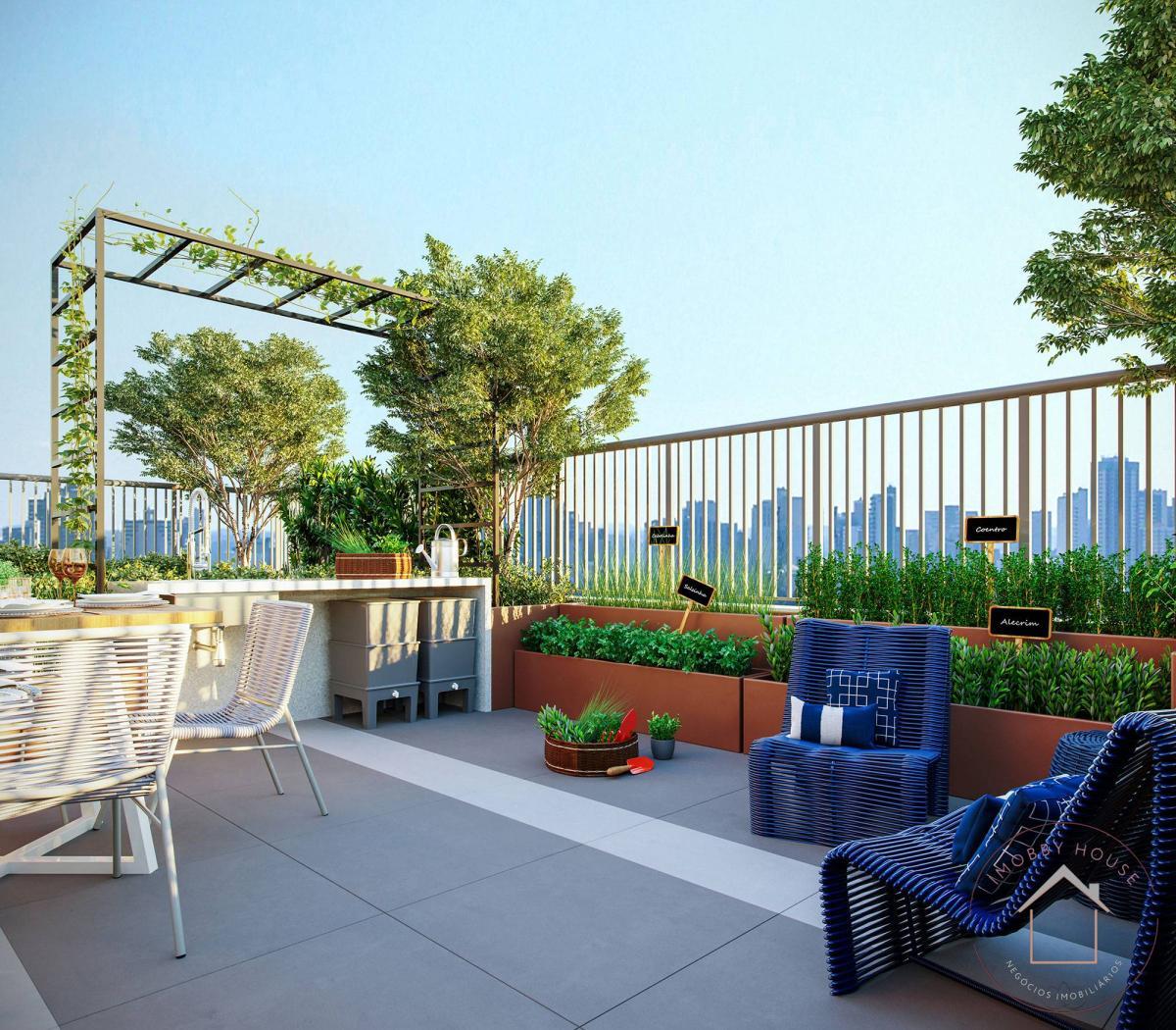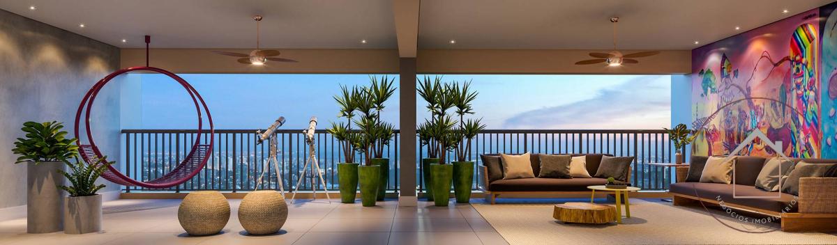 Sauna seca com lounge para descanso, Espaço gourmet externo, Fitness externo, Pet place, Piscina adulto com área de solarium e deck molhado, Salão de festas, Home cinema e Fitness, Lounge com mirante, Churrasqueira com forno de pizza, Praça do fogo, Horta e pomar comunitários.